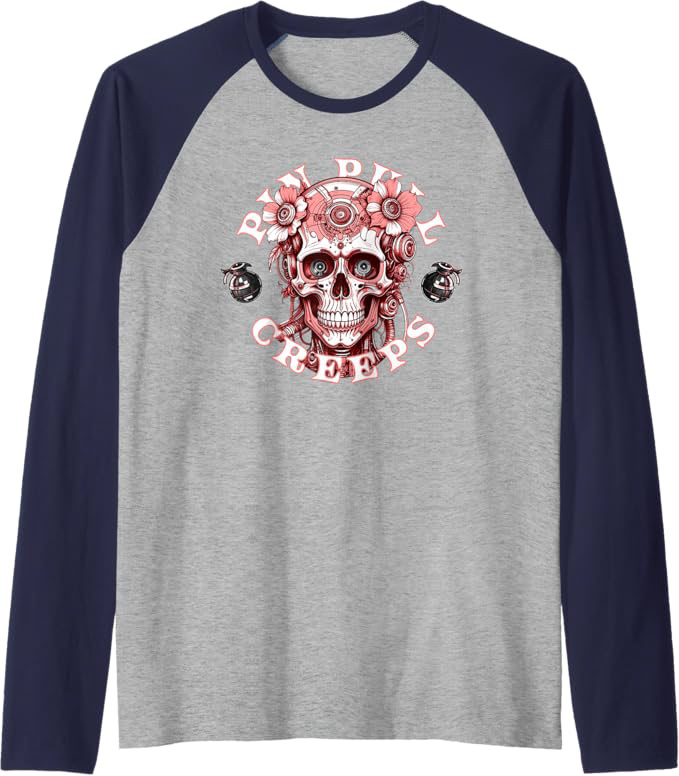 The details: Features a reinforced double-needle sleeve and bottom hem for structural integrity. The contrast collar and sleeves serve as a visual frame for the central mechanical-skull motif.